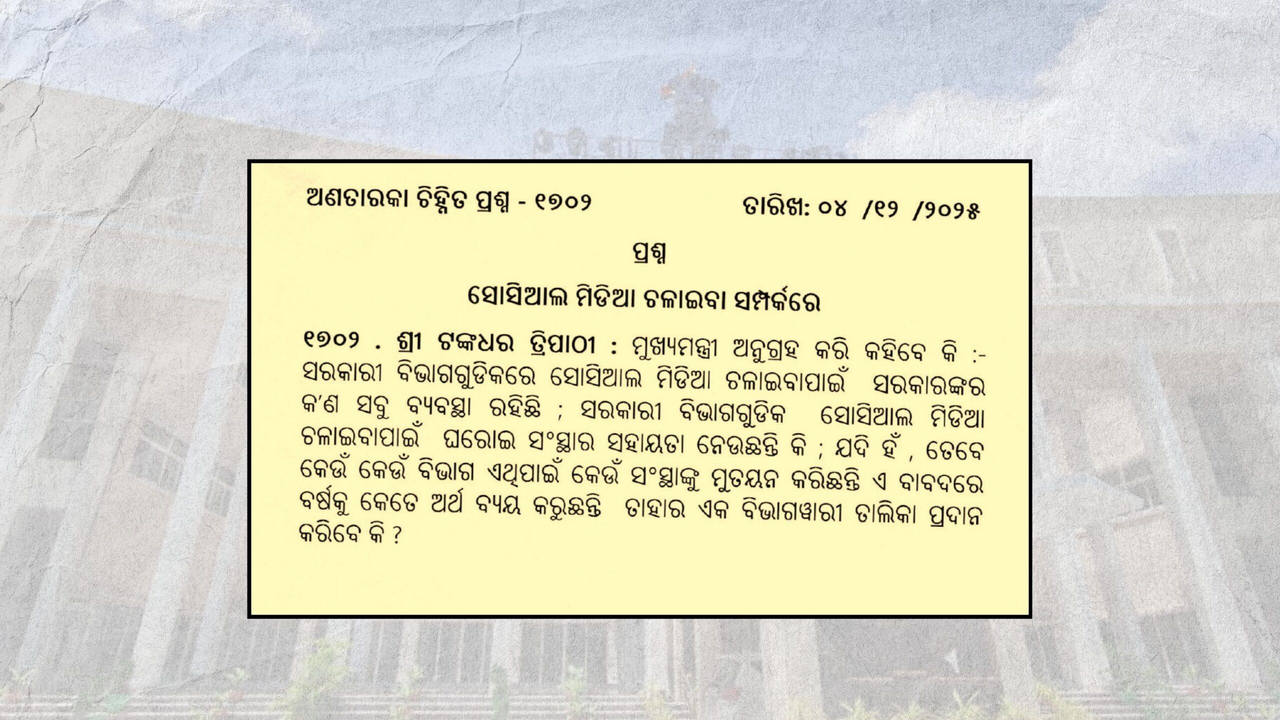 Bhubaneswar: A major political discussion erupted inside the Odisha Legislative Assembly on 4 December 2025 after BJP MLA Tankadhar Tripathy raised a pointed question to Chief Minister Mohan Charan Majhi. The MLA wanted to know how various government departments manage their social media activities and whether they depend on private agencies for this work. He also sought department-wise data on how much money is being spent on social media management in the current year.